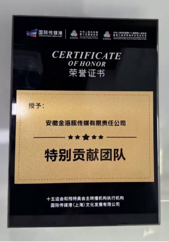 近日,第十五届全国运动会广东赛区执行委员会和全国第十二届残疾人运动会暨第九届残疾人特殊奥林匹克运动会广东赛区执行委员会发来感谢信,对安徽金海豚传媒有限责任公司在十五运会及残特奥会期间提供的专业支持与精湛服务予以高度肯定。同时,赛事主转播机构执行机构授予安徽金海豚传媒有限责任公司“特别贡献团队”荣誉称号。